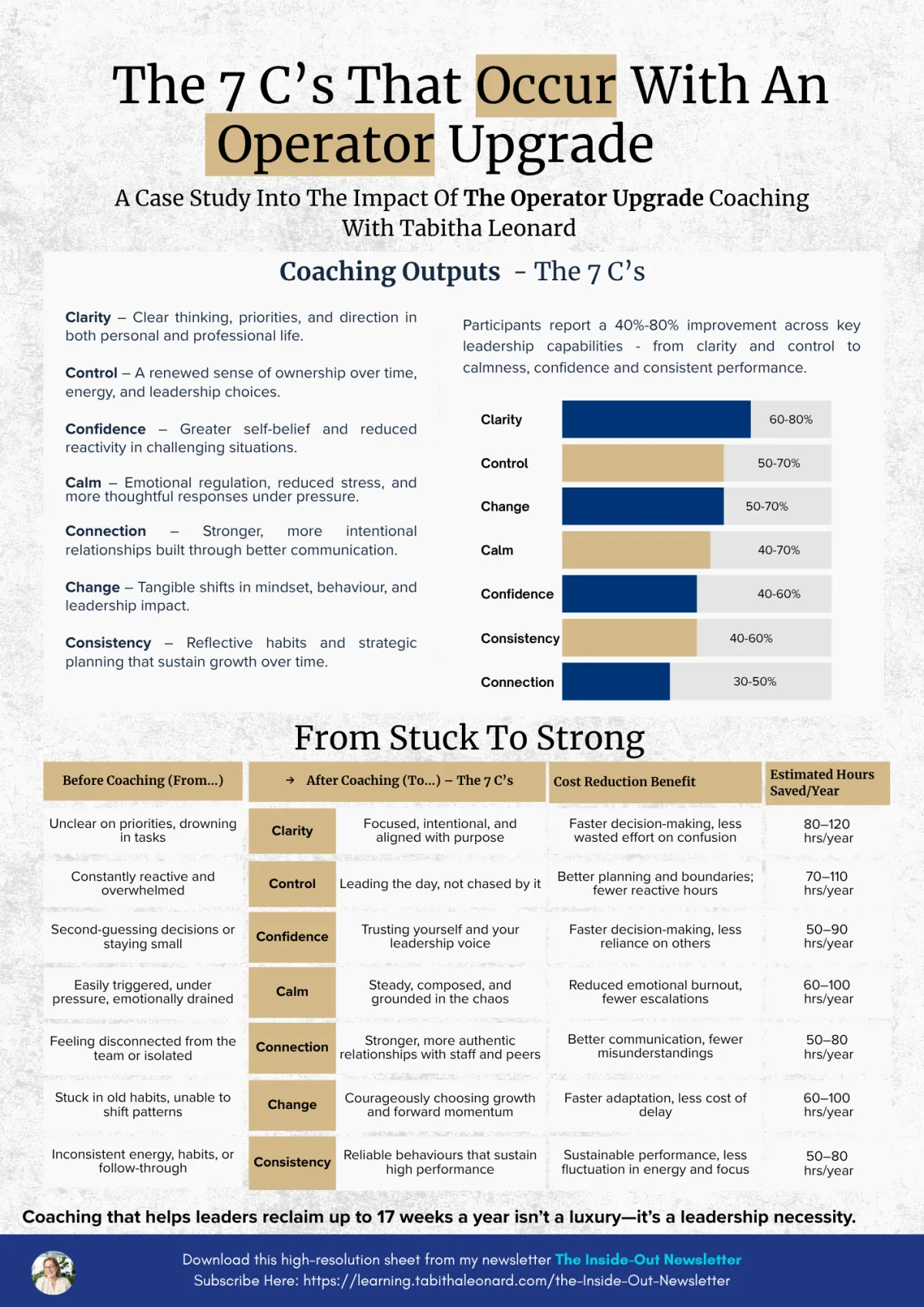 It upgrades the operator behind the business — your identity, energy, decision-making, and communication — so you can lead with confidence even when the pressure spikes.