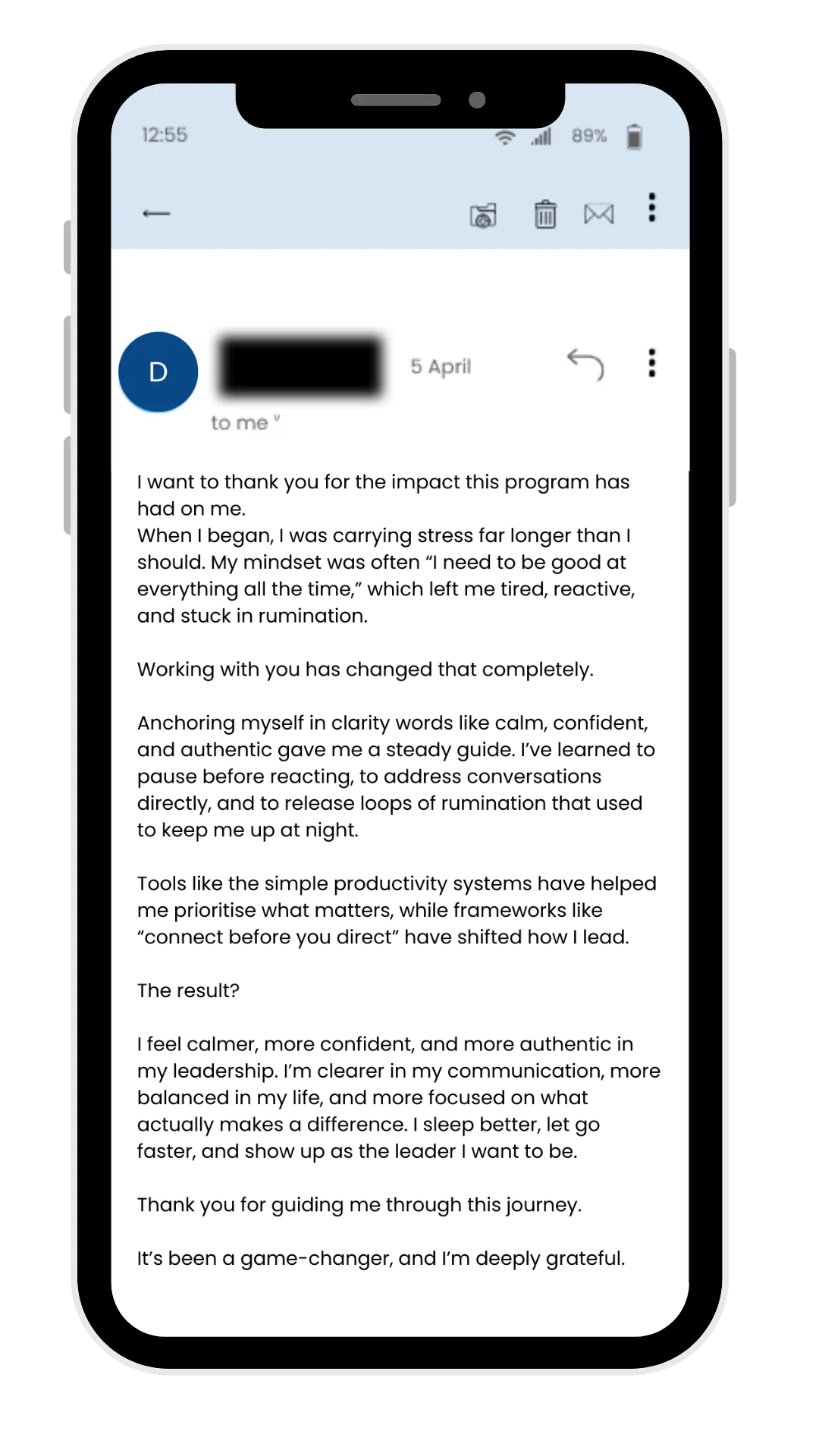 The transformation was significant. Dave now approaches challenges with composure and perspective, no longer carrying others’ emotions or performance issues as his own. He lets go of unnecessary loops, sleeps better, and has found greater balance between work and life. His communication has sharpened—short, clear, and compassionate—and his leadership presence has deepened.