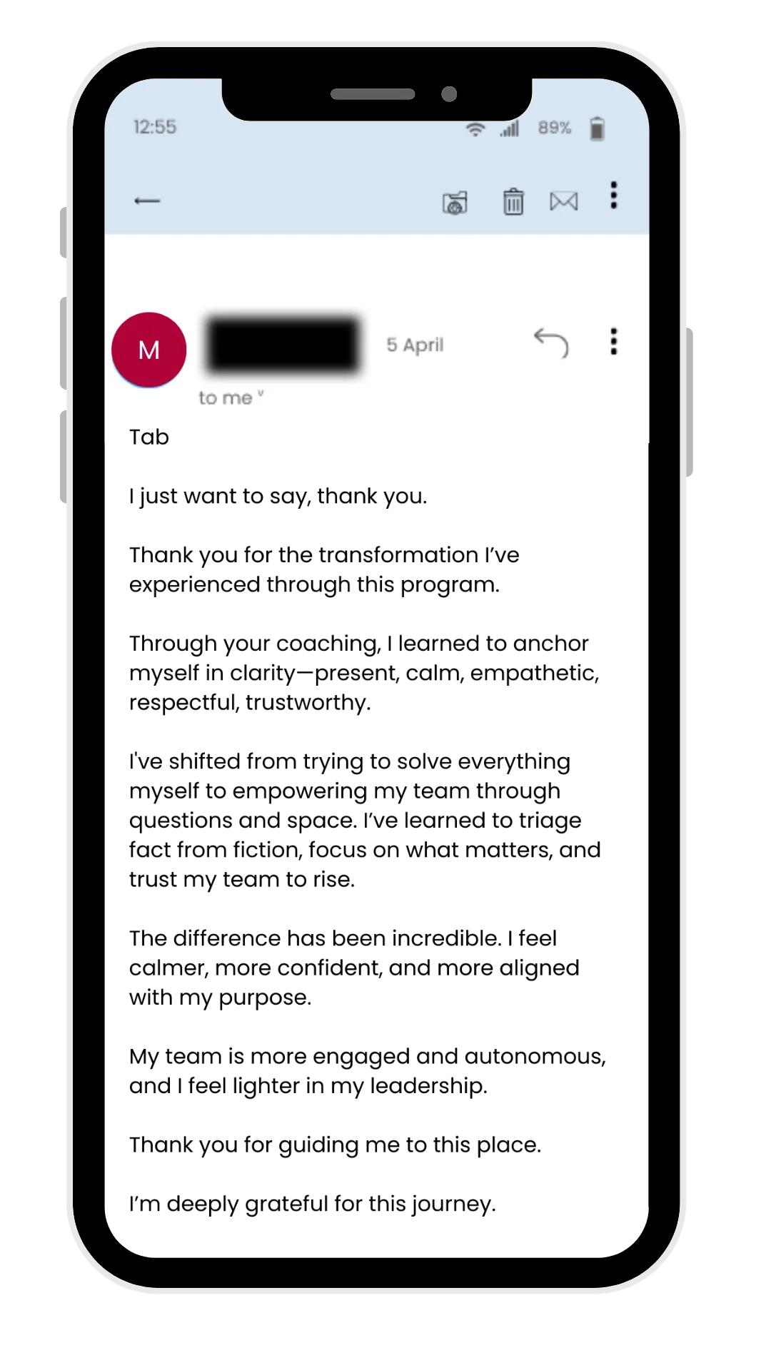 Before coaching, I was stretched thin—constantly supporting others but losing sight of my own direction. Working with Tabitha gave me space to pause, reflect, and reconnect with what matters most.